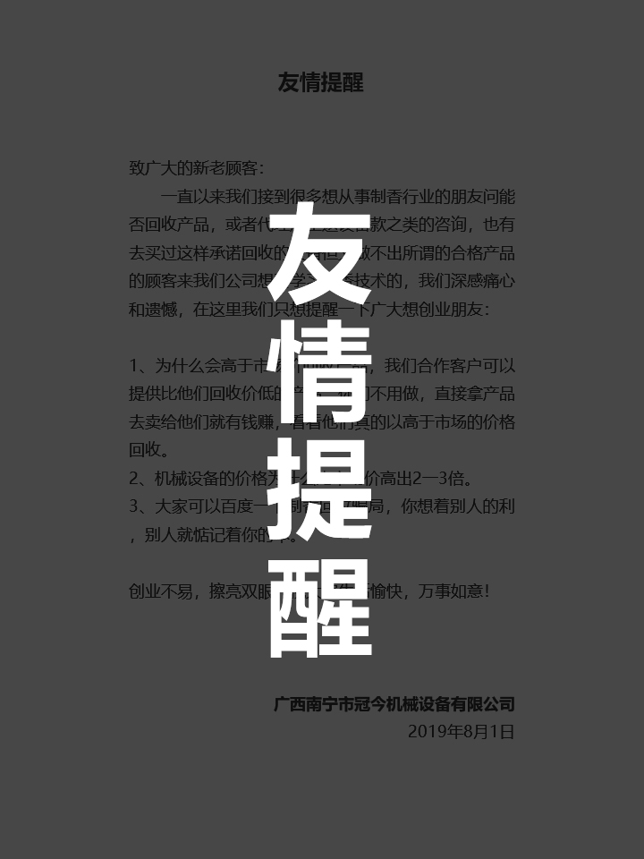 購(gòu)買冠今制香機(jī),享受八大保證,讓您創(chuàng)業(yè)無(wú)憂!冠今制香機(jī)八大支持保證系統(tǒng):強(qiáng)力支持 后顧無(wú)憂 1.現(xiàn)場(chǎng)觀摩:免費(fèi)在制香廠里參觀各種香生產(chǎn)流程,滿意后再做決定。 2.專業(yè)培訓(xùn):購(gòu)制香機(jī)...